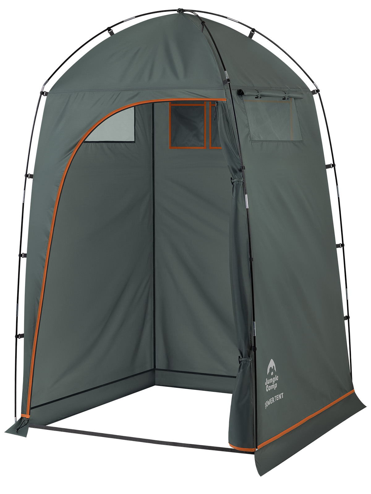 Универсальный и тент-шатер JUNGLE CAMP Shower Tent можно использовать как душ или туалет во время кемпинга на природе. Легко собирается одним человеком. Удобная, большая D-образная дверь. На задней стенке 2 многофункциональных кармана из сетки для душевых принадлежностей. Эластичный шнур вдоль окна позволяет повесить полотенце и одежду. Тент хорошо проветривается благодаря 2-м большим окнам из сетки. При необходимости окна можно закрыть шторками. Защитная юбка по всему периметру шатра. Под куполом находится крючок для переносного душа. Наличие оттяжек и колышков увеличивают ветростойкость тента при неблагоприятных погодных условиях. Снабжен удобным чехлом с ручкой для переноски и хранения.